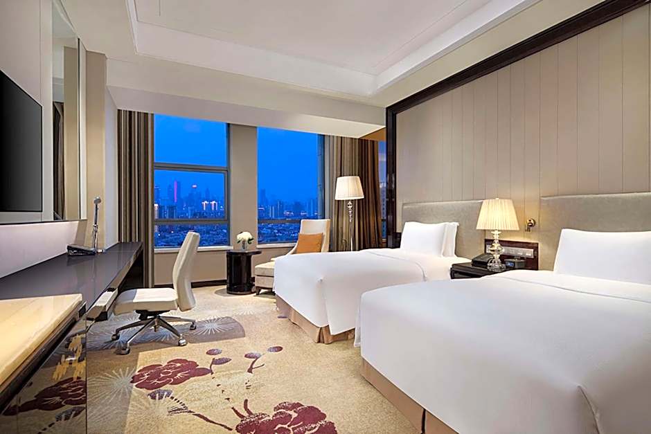 Overlooking the city, this luxurious suite comes with a separate living room, a BOSE sound system and a large marble bathroom.